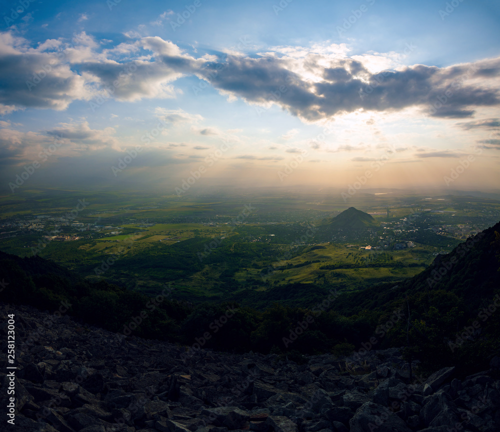 Large panorama view from the mountain Beshtau, summer sunny day near Pyatigorsk