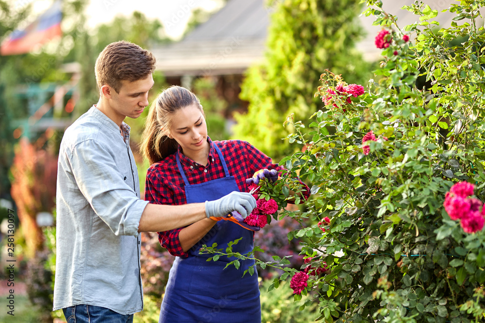 Guy and girl gardeners cut the rose bush in the wonderful garden on a sunny day.