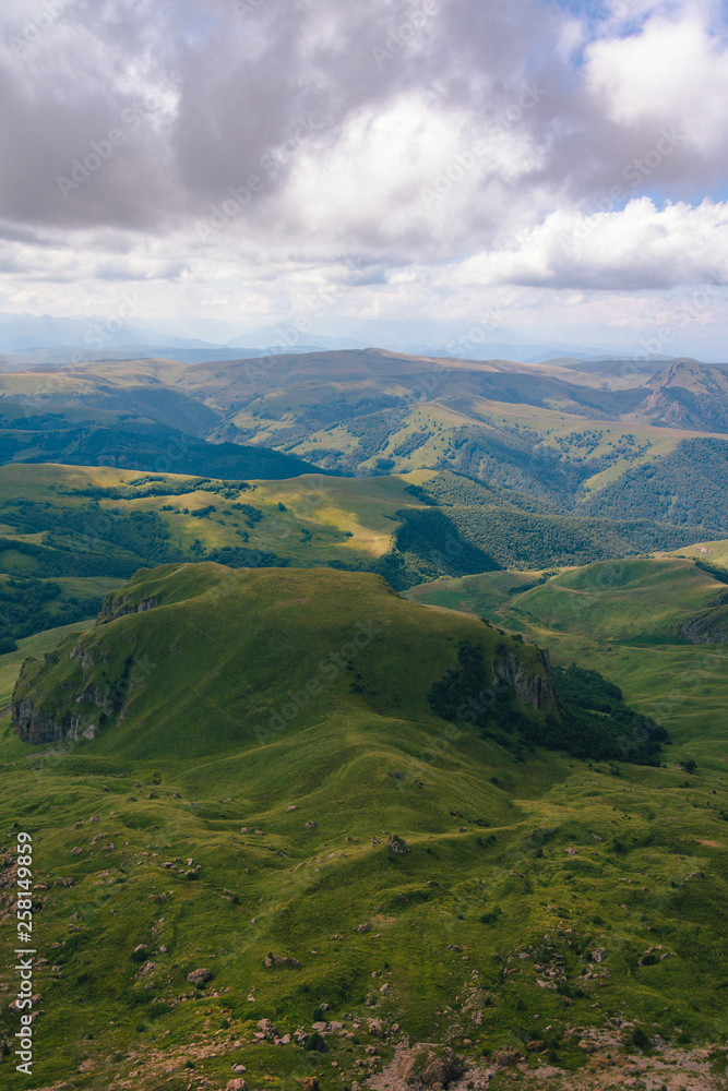 View from the Bermamyt Plateau on a summer day. Hills and clouds in the distance.
