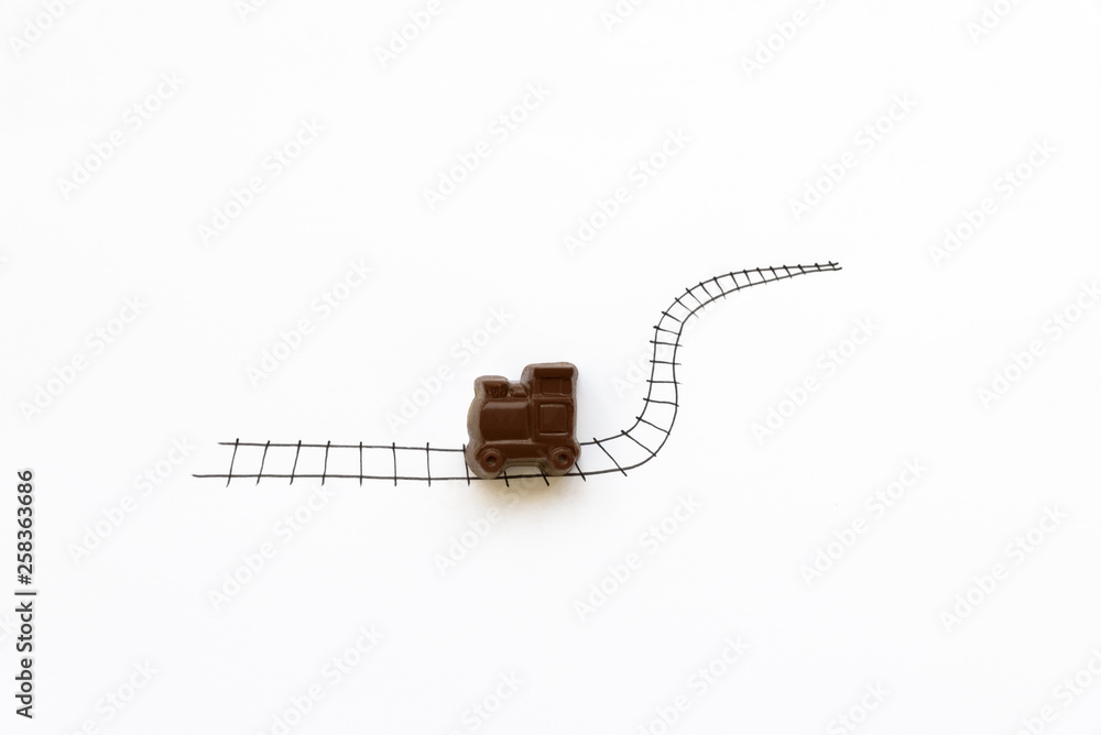 Hand drawing railway with chocolate train toy. Minimal, creative, travel or food art concept. Copy space