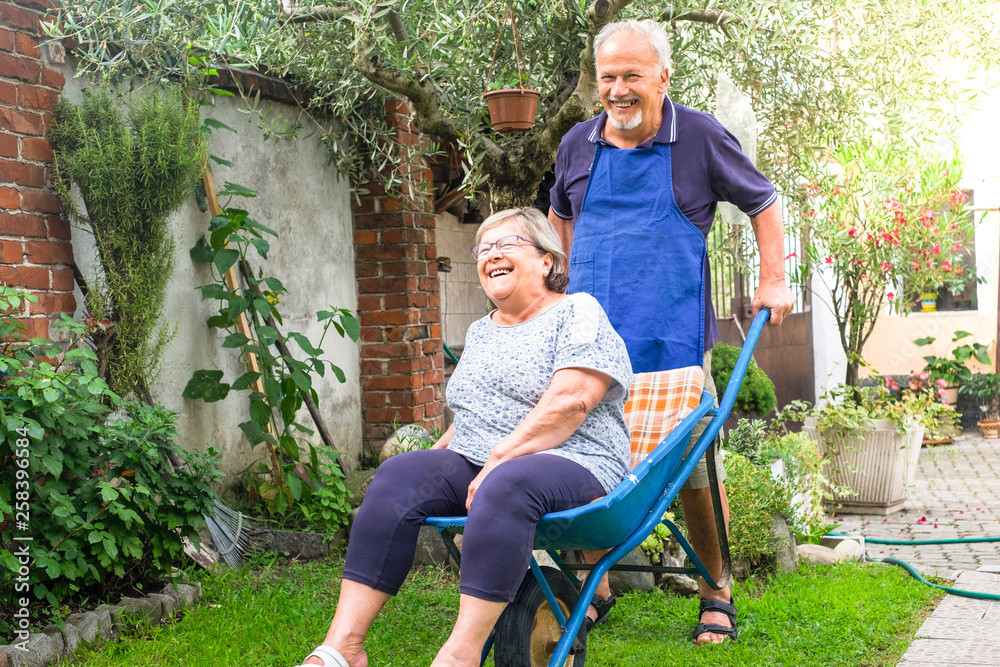 old man carry the aged wife at home outside in the jardin. laughing and happy together senior couple playing and joking at home. nice leisure activity outdoor for happiness lifestyle.