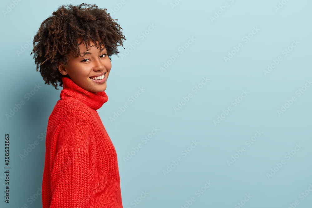 Sideways shot of cheerful dark skinned woman stands in profile, has gentle smile, white teeth, wears red jumper, being in high spirit, isolated over blue background with free space aside for text