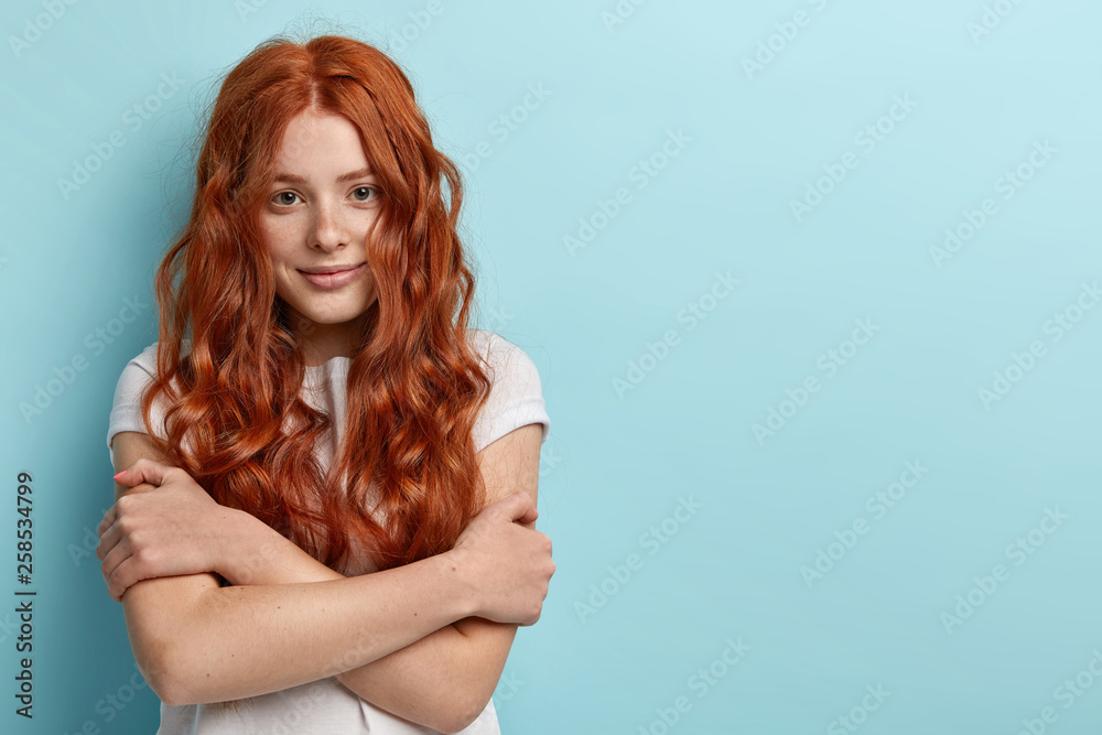 Teens and beauty concept. Pretty teenager with healthy freckled skin, no make up, wears white t shirt, embraces herself, has timid facial expression, feels shy during first date, stands over blue wall