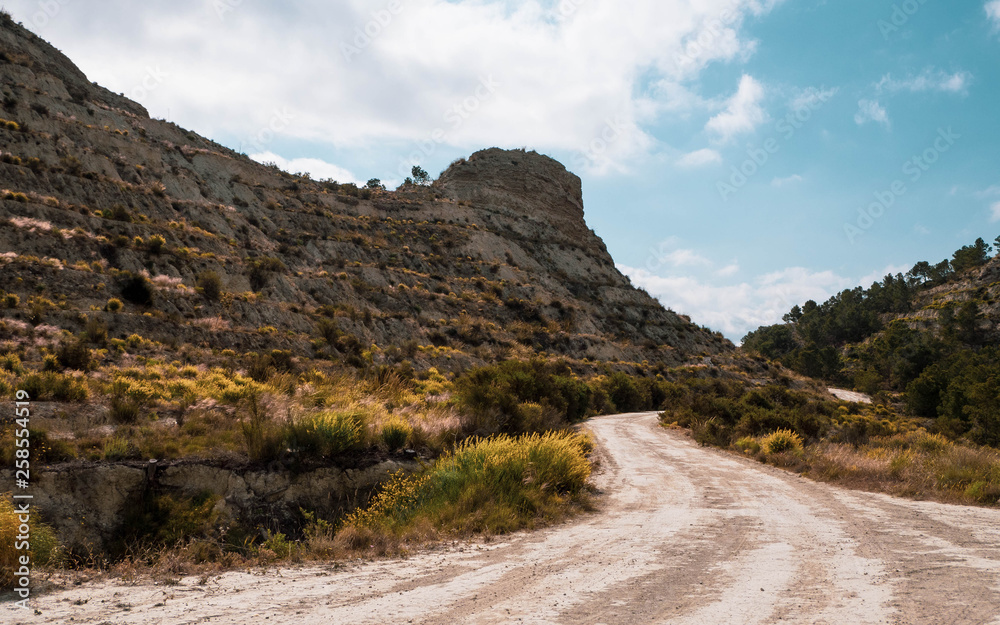 Dirt path by the mountain on a sunny cloudy day with bluee bright sky