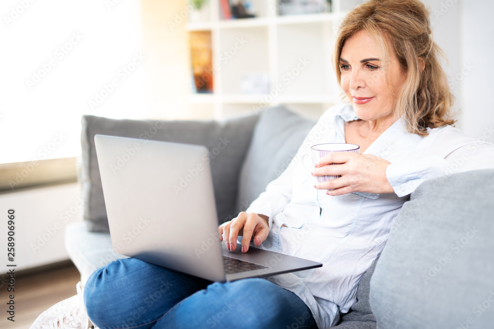 Ältere Dame sitzt gemütlich auf der Couch und schaut in ihren Laptop