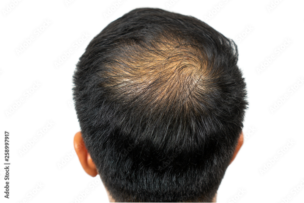 Close up young asian man bold head in the middle with black hair surround. Asian man hair loss in the middle. Isolated white background.