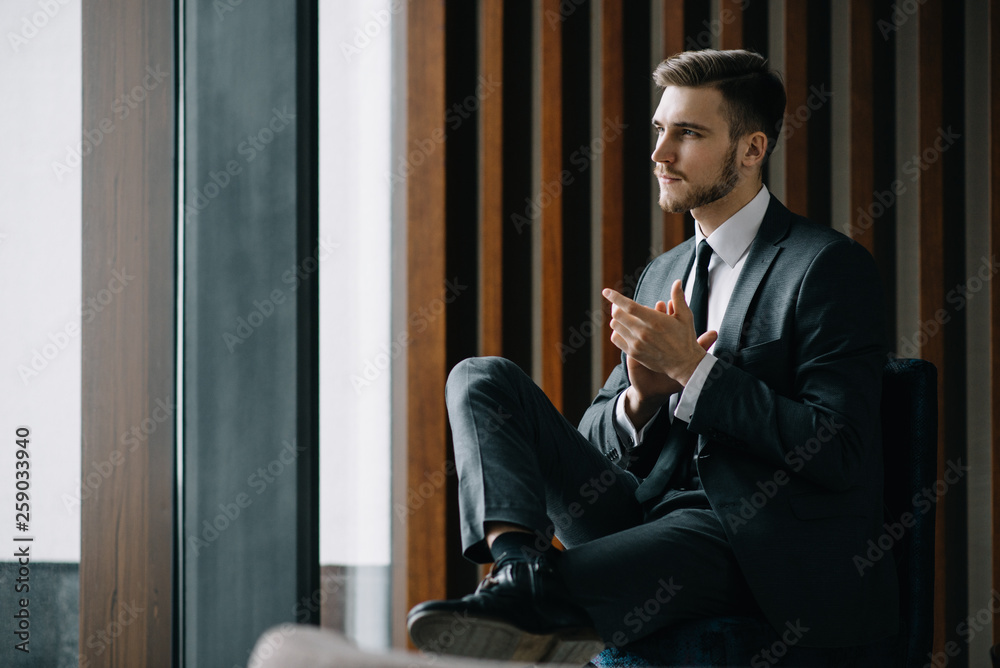 Young man drawing template for the web site associated with digital marketing, current trends and tendencies of UX / UI design. Businessman who rules his company remotely, like a freelancer