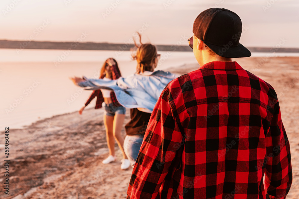 Group of hipster young couples on beach together walking during sunset. Love, relationship and friendship