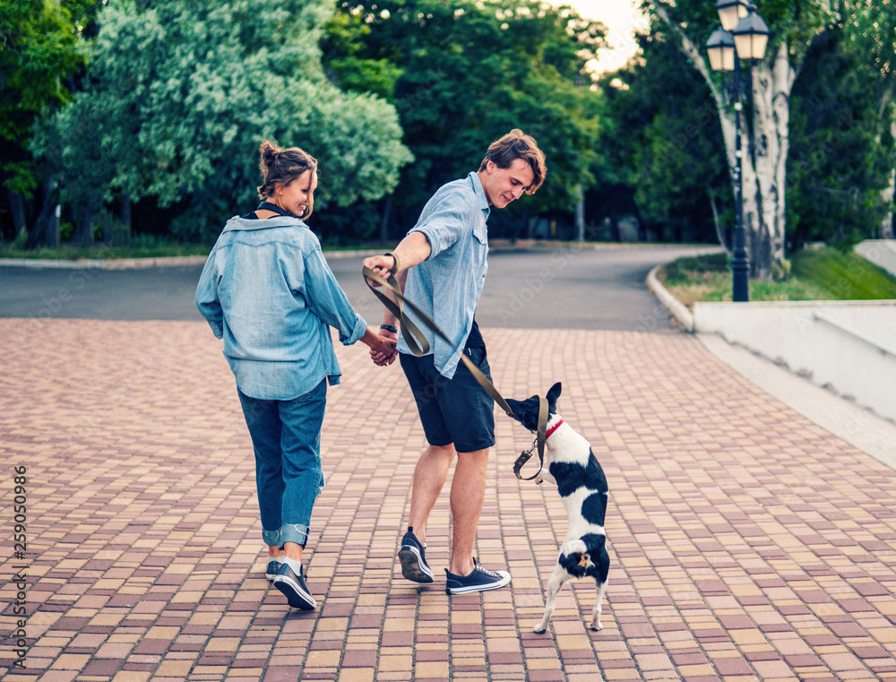 Lovely young hipster couple walking with dog during summer sunset. they wear jeans clothes. modern youth