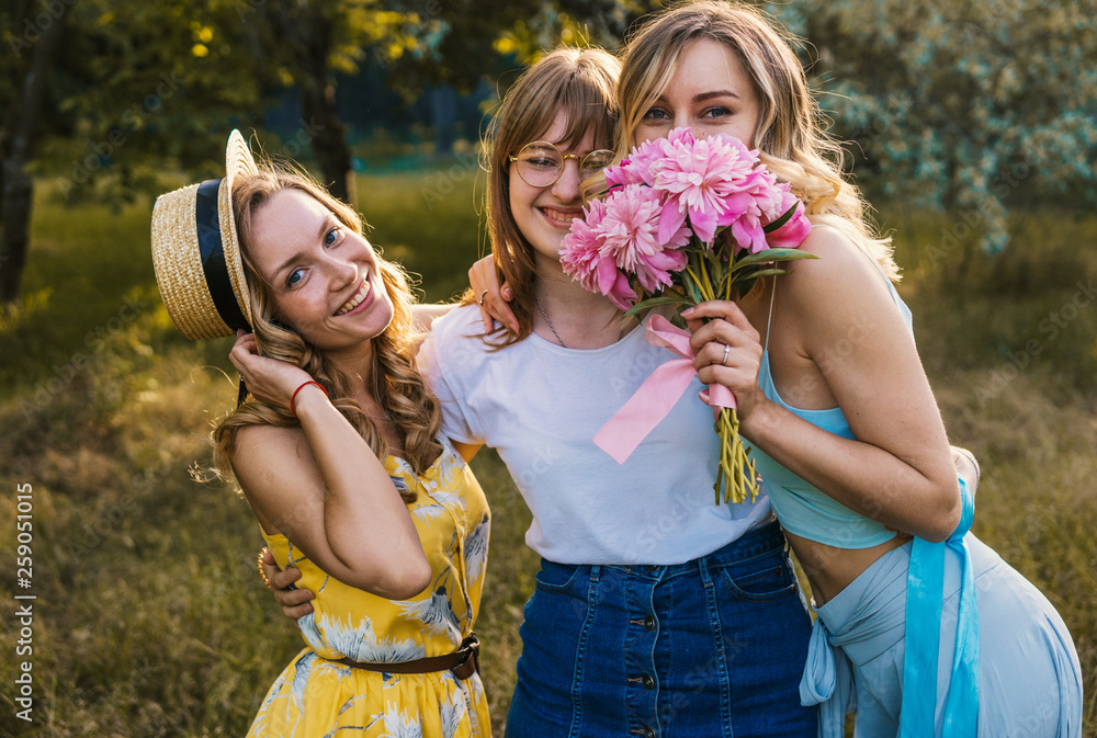 Three girls friends outdoor in the park or forest. bachelorette, party