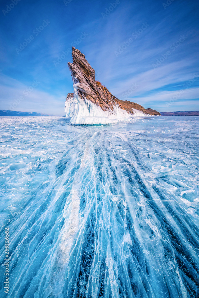 Tail of Ogoy island with natural breaking ice in frozen water at Lake Baikal, Siberia, Russia.