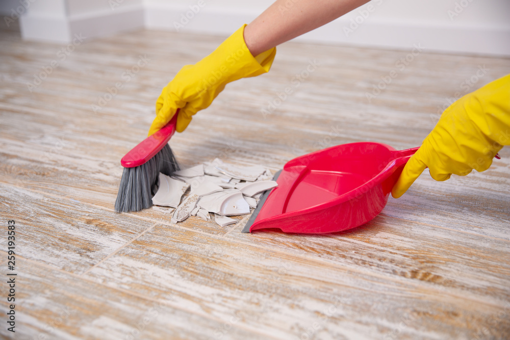 Clean up broken plate with broom and dustpan
