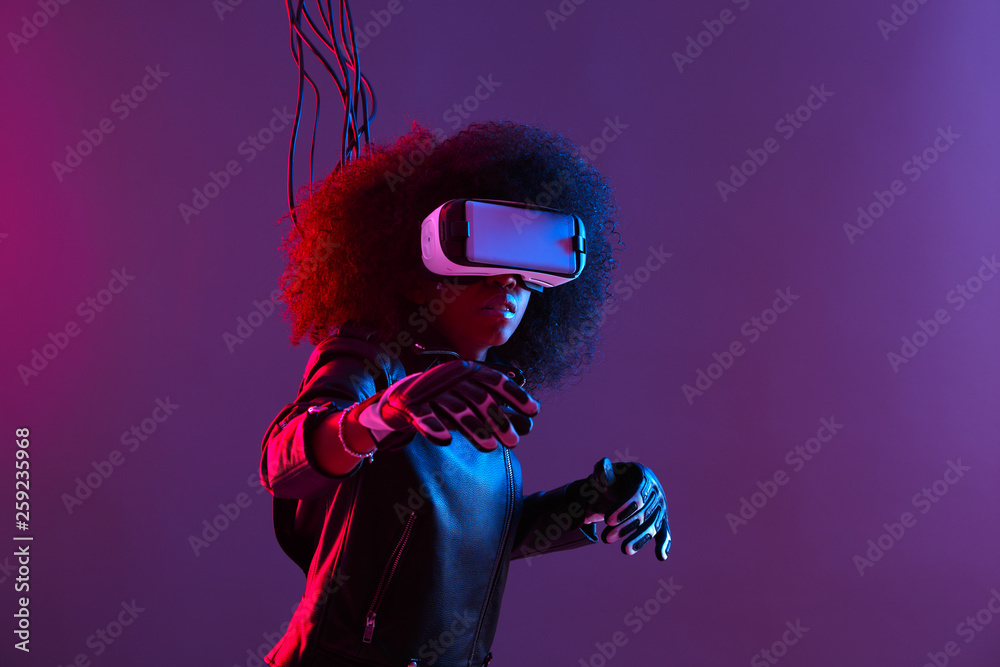 Mod curly dark haired girl dressed in black leather jacket and gloves uses the virtual reality glasses on her head in the dark studio with neon light