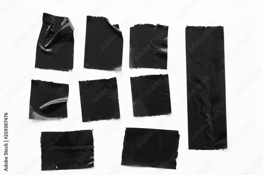 Set of black tapes on white background. Torn horizontal and different size black sticky tape, adhesive pieces.