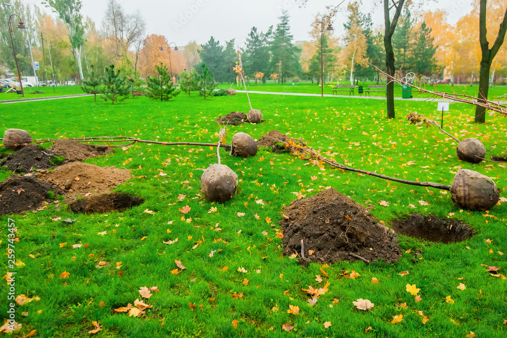 preparation for planting trees and shrubs in the urban park area, accomplishment of territory