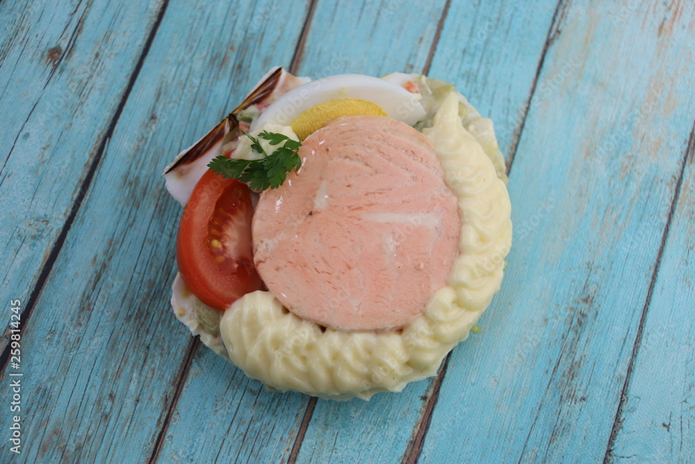 Médaillon de saumon et mayonnaise dans une coquille Saint Jacques