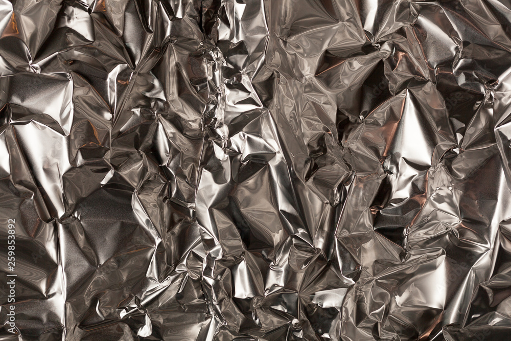 Full frame take of a sheeT of crumpled silver aluminum foil
