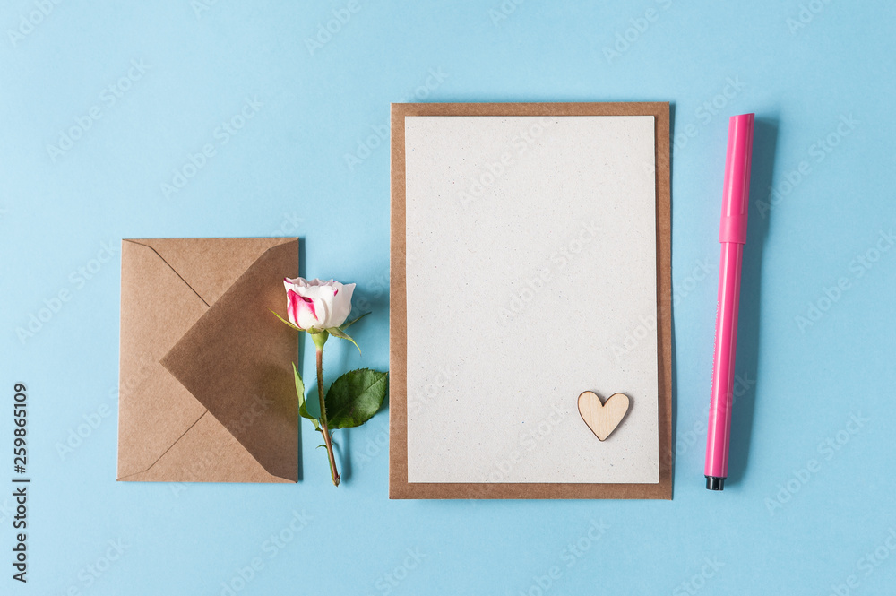 Blank card with rose and felt pen on blue background. Holiday concept. Love confession note. Minimalism, soft focus, top view, flat lay, copy space.