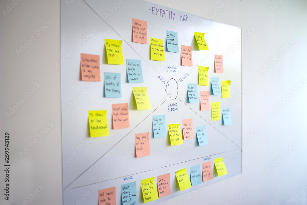 Empathy map, user experience (ux) methodology and design thinking technique used as a collaborative tool that teams can use to gain a deeper insight into their customers, users and clients.
