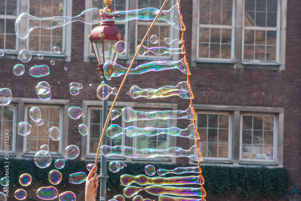 Farbenfroh schillernde Seifenblasen leuchten und glitzern im Sonnenschein