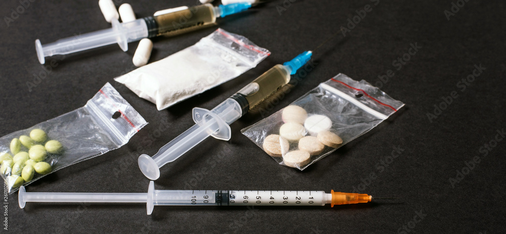 Hard drugs on dark table. heroin, cocaine, amphetamine, ecstasy, pills and more. Creative idea. Drugs. Sad. Die. Illness