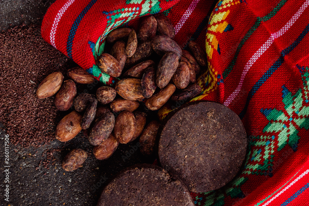 Cocoa, mexican chocolate and cacao powder on a traditional metate, used to extract the powder from the cacao beans or cacao nibs