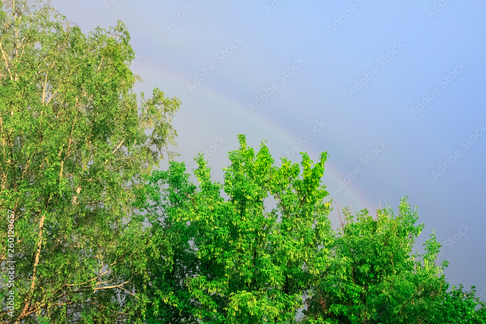 Spring landscape of a rainbow in the sky after the rain over the trees with green leaves.