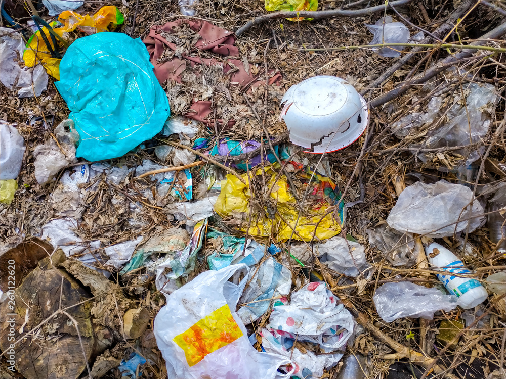 Plastic garbage, disposable dishes and packages in the forest. Pollution in the wild. Unauthorized garbage dump in the park area. The interaction of people and the environment.