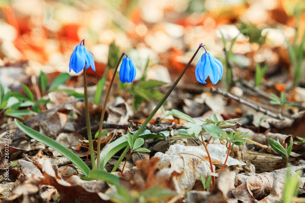 Blue scilla (Scilla bifolia) flowers in the forest. First spring flowers