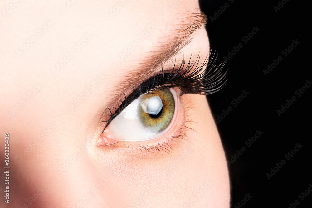 Female green eye with long eyelashes on the black background close-up. Eyelash extensions, lamination, cosmetology, ophthalmology concept. Good vision, clear skin.