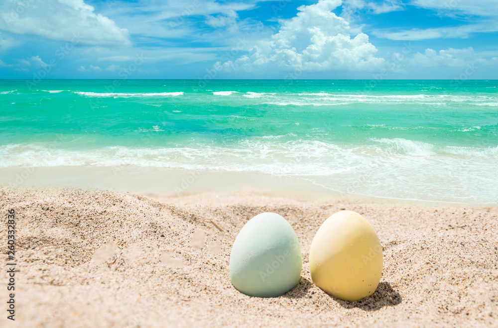 Happy easter lettering background with eggs on the sandy beach