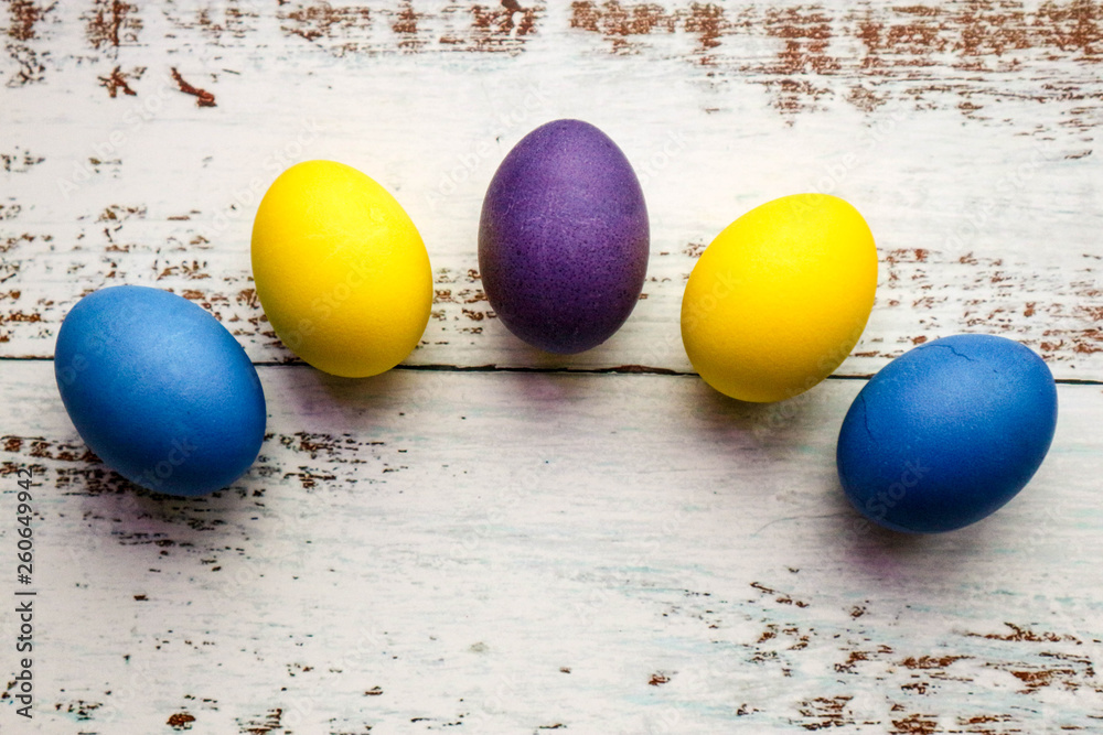 Row of five colorful easter eggs on wooden background