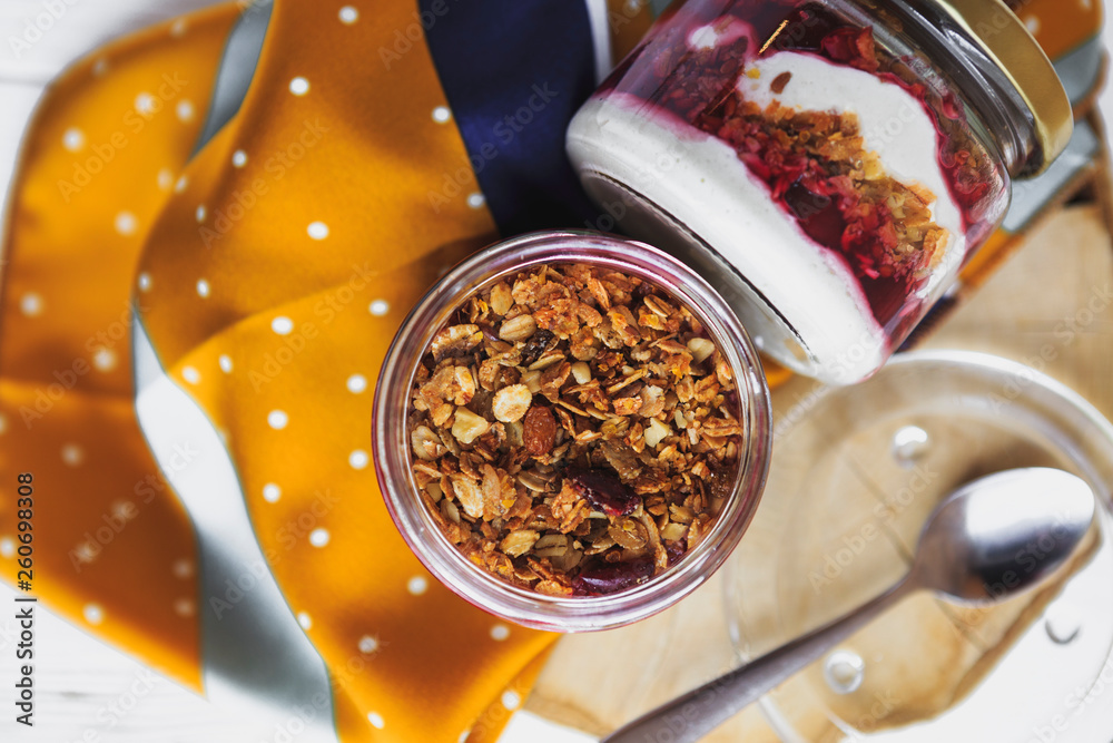 Summer fruit red berry breakfast. Healthy cherry split breakfast with cream cheese, granola, nuts and dried fruits white chocolate. In mason jar, on table. Copy space