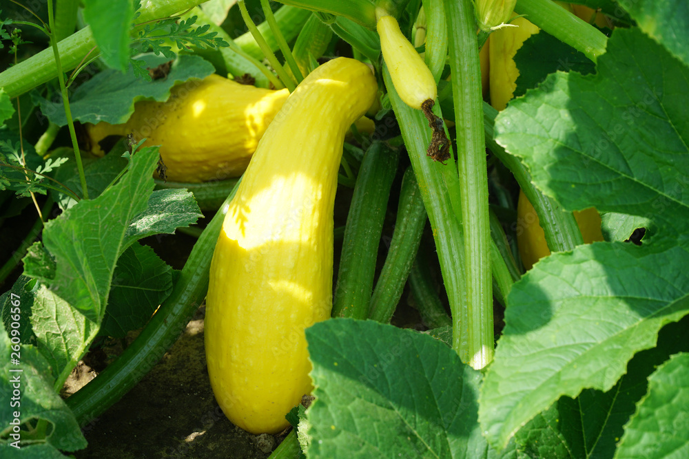 Yellow squash and plant in the farm field