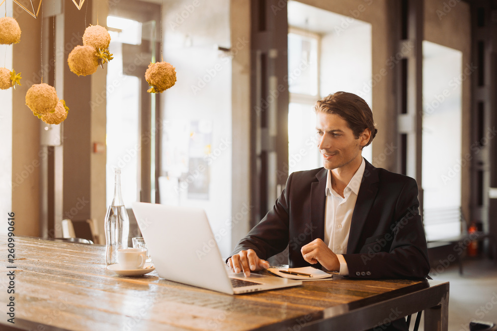 Young businessman working on a plan of Internet project on the laptop. Man discusses business matters by phone. Working computer for internet research. Digital marketing. Development