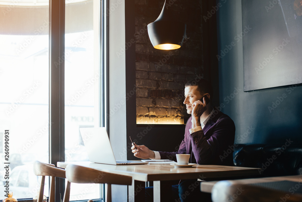 Young handsome man sitting in office with cup of coffee and working on project connected with modern cyber technologies. Businessman with notebook trying to keep deadline in digital marketing sphere.