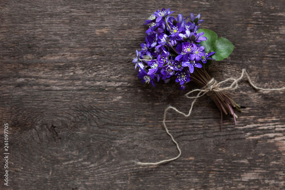 Top view of Small fresh bouquet of violet hepatica flowers on vintage wooden background