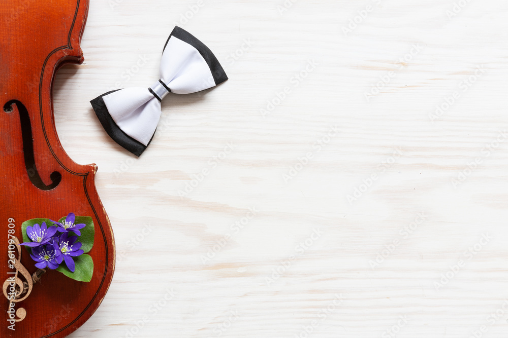 Old violin, little bunch of violet hepatica flowers and bow tie on the white wooden background. Top view, close-up.