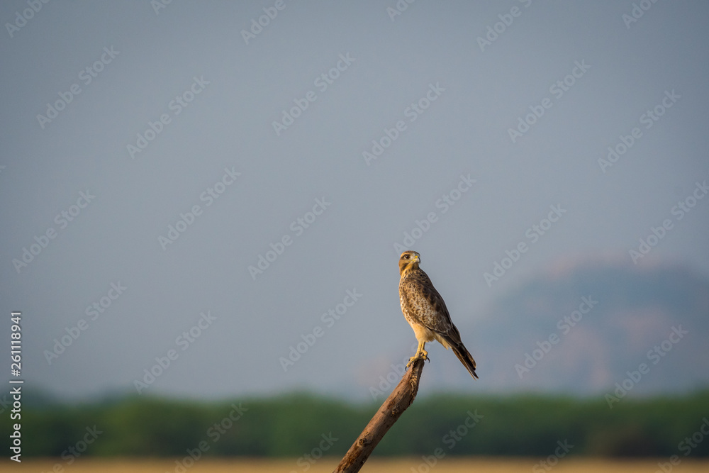 A habitat image of White-eyed buzzard or Butastur teesa sitting on a beautiful perch at tal chappar blackbuck sanctuary, India