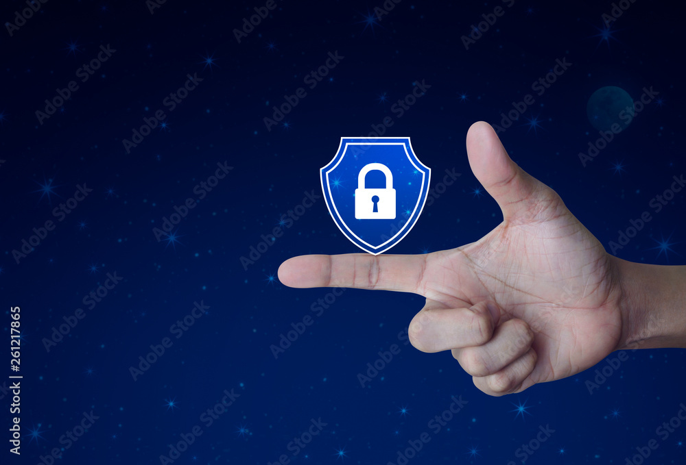 Hand pressing padlock with shield flat icon over fantasy night sky and moon, Business security insurance concept