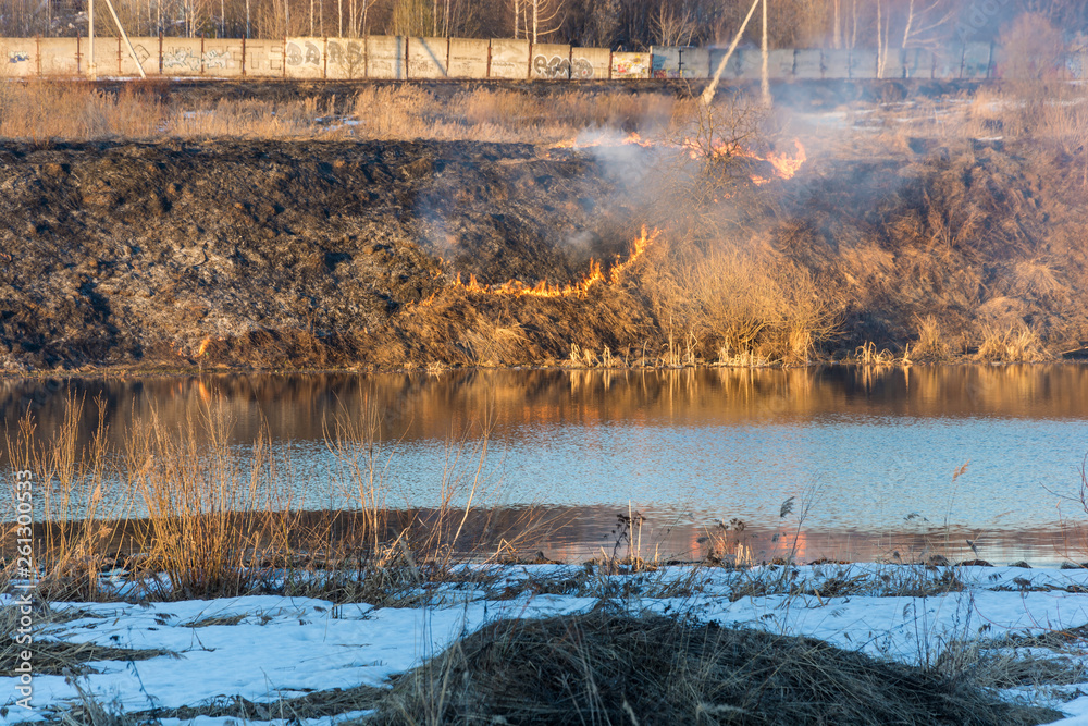 Last year’s burning grass on the bank of a small river in the rays of the evening sun.