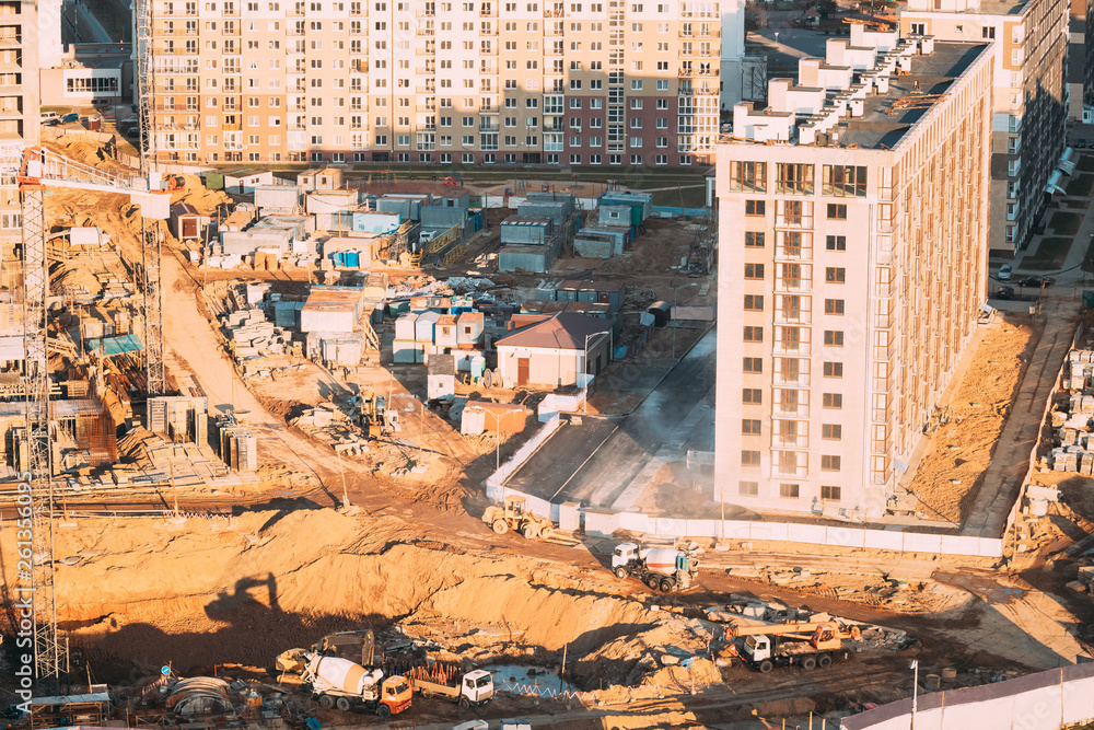 Special Concrete Transport Truck In-Transit Mixer Unit, Truck And Mobile Crane Of Jib Type On City Building Site. Construction Of Houses