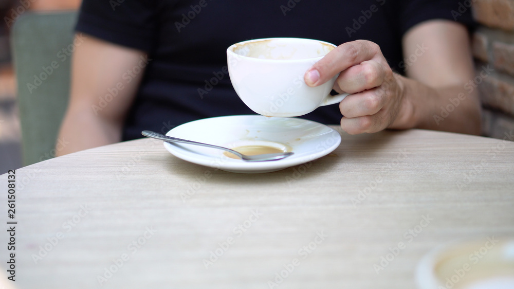 Young Caucasian Balding Man Drinking Coffee At Outdoor Cafe With People in Background