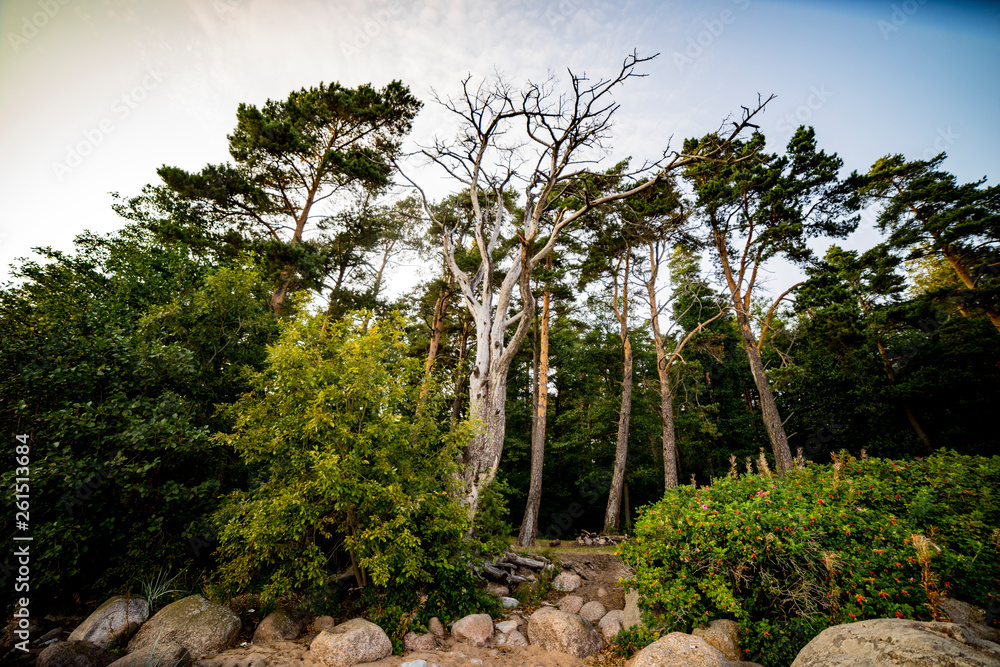 a huge old tree standing proudly on the shore of the Gulf of Finland surrounded by young pines and bushes.