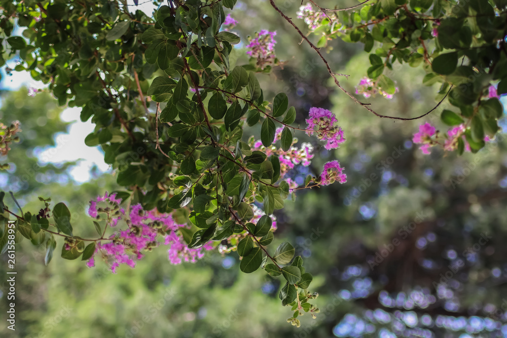 Beautiful bokeh background with crepe myrtle in foreground and blurred trees and sky behind