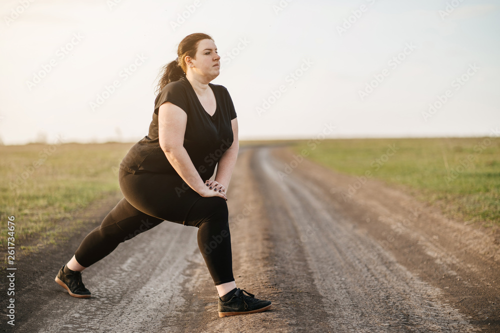 Cropped portrait of woman in sportswear training legs getting ready for running in the meadow, copy space. Healthy lifestyle, sport, weight losing, activity concept
