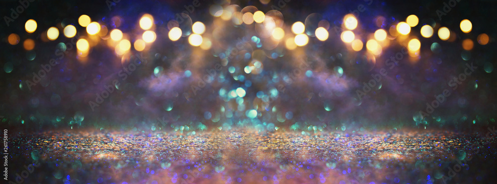 glitter vintage lights background. black, purple, blue and gold. de-focused