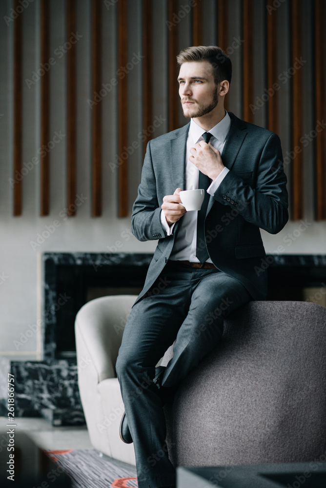 Young handsome man sitting in office with cup of coffee and working on project connected with modern cyber technologies. Businessman with notebook trying to keep deadline in digital marketing sphere.