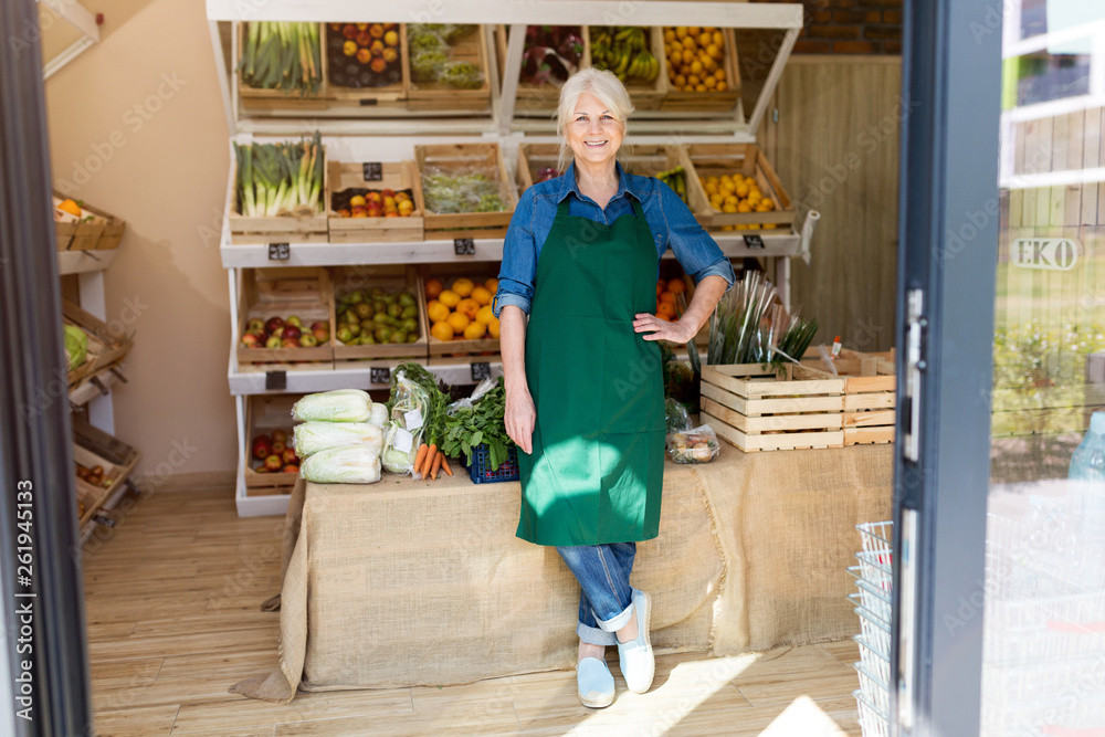Senior woman working in small grocery store