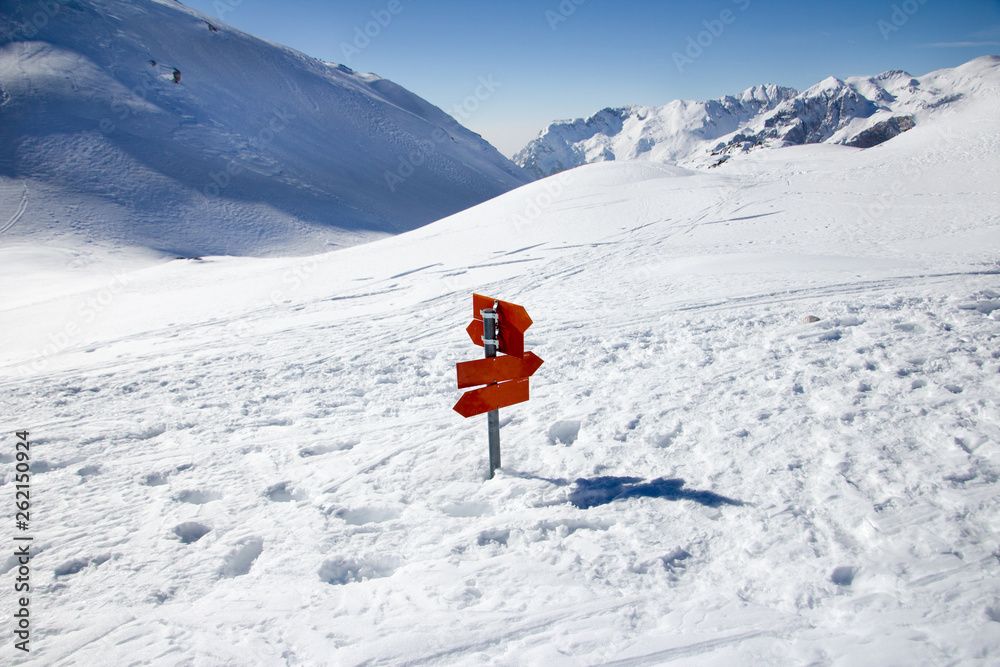 The red signpost in the winter mountains, Slovenia, Julian Alps